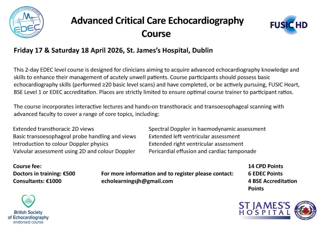 The Advanced Critical Care Echocardiography 2-day Course will take place on Friday 17 and Saturday 18 April 2026 in St. James’s Hospital, Dublin. See course flyer attached.