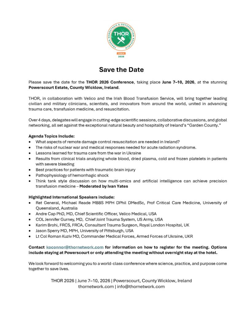 The THOR Network (Trauma Hemostasis & Oxygenation Research) is holding a conference in Powerscourt, Co Wicklow from June 7-10, 2026. This is the first time this annual conference is being held in Ireland. PDF and provisional agenda attached.
